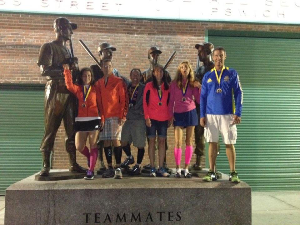It was over. And I was glad. I cramped and cramped all the way from the buses to get our stuff to the letter "B" where we were meeting our Bedford friends. We saw Bill and Jimmy there and explained to them what happened to us. The biggest surprise of the day was that Bill looked GREAT. Jimmy didn't look quite so great and ended up in the medical tent for a brief time. Kathy had struggled with bathroom issues, John had cramped all over, Allen had sucumbbed to the heat and was even turned away by a Wellesley girl, and Robin nearly melted...but we ALL FINISHED. Take that, Boston!So, what now? As much as I'd love to lace up and get right back to running--it's clear that I can't. My body is, from all angles, revolting. Especially my left knee/IT band. I got the shot to get through the race. I barely did that, so now it's time to get rid of the pain for good. I have a doctor's appointment tomorrow, and I'll go from there. No running for likely 14 days. After this little break, it's time for Dances with Dirt. For now, all I can say is that I EARNED that jacket!